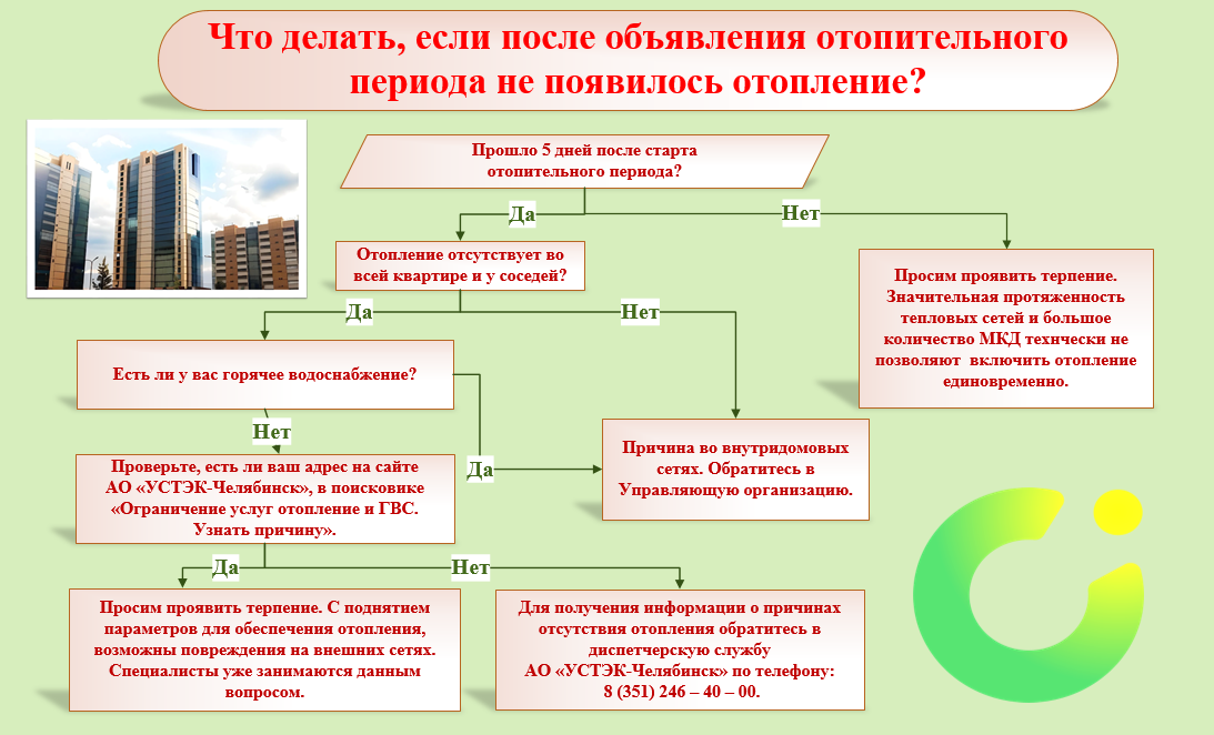 Уважаемые потребители! В случае, если по истечении указанных дней в вашем доме не появилось отопление, предлагаем воспользоваться алгоритмом памятки «Что делать, если после объявления отопительного периода не появилось отопление».