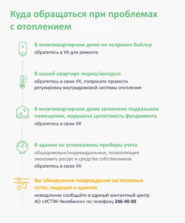 - если вы обнаружили повреждение на тепловых сетях, ведущих к зданию – немедленно сообщайте в единый контактный центр АО «УСТЭК-Челябинск» по телефону 246-40-00.