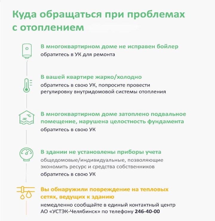 - если вы обнаружили повреждение на тепловых сетях, ведущих к зданию – немедленно сообщайте в единый контактный центр АО «УСТЭК-Челябинск» по телефону 246-40-00.